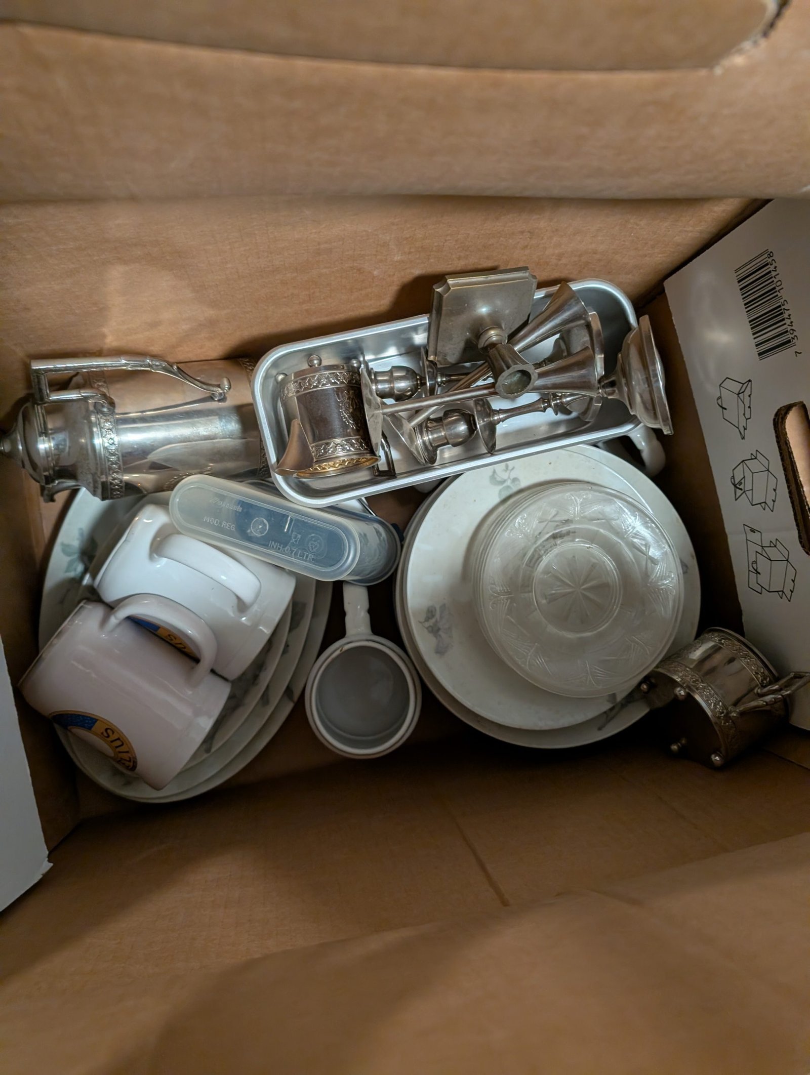 Flera kassar med gott och blandat med bland annat skärskiva i glas, muggar och barnsaker. En kasse med kaffemuggar, ett Dvd ställ, två svarta hyllor, en väggklocka, mattor, cd skivor, blandad låda med bland annat överkast, Dvdlåda, 39 stycken Horisont böcker, skor, väskor ouppackad hylla från Hjula.