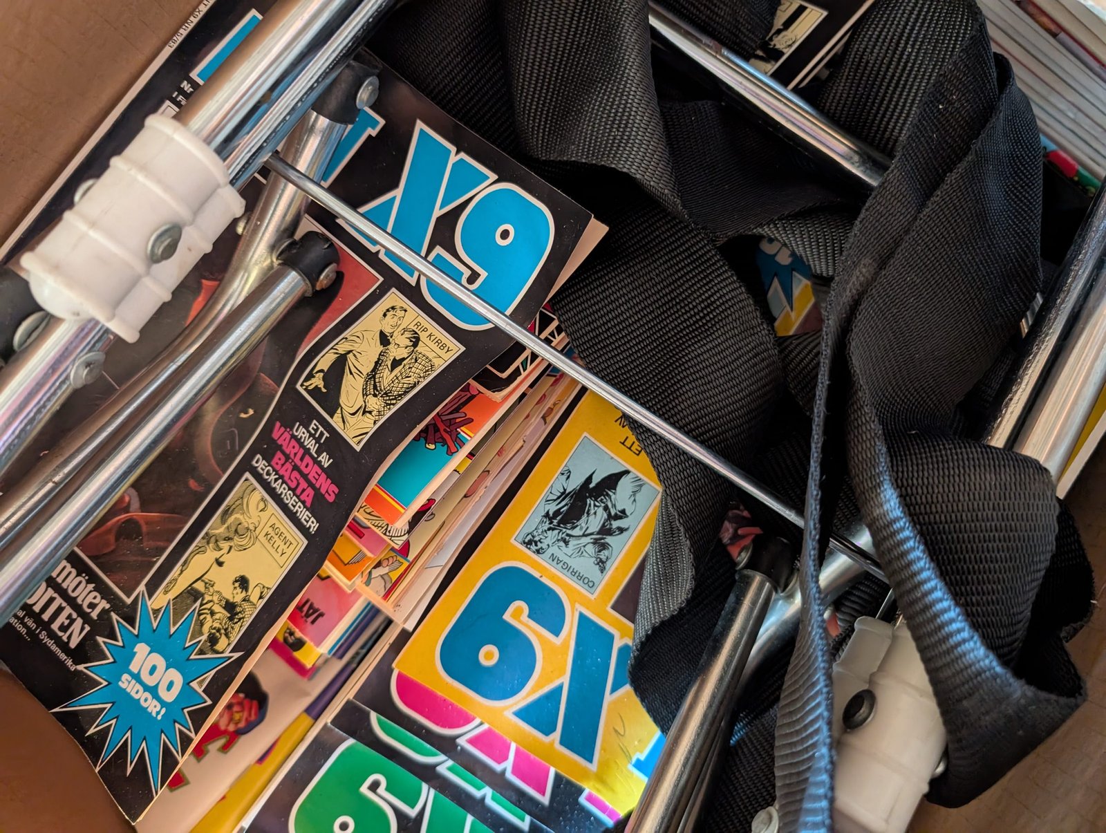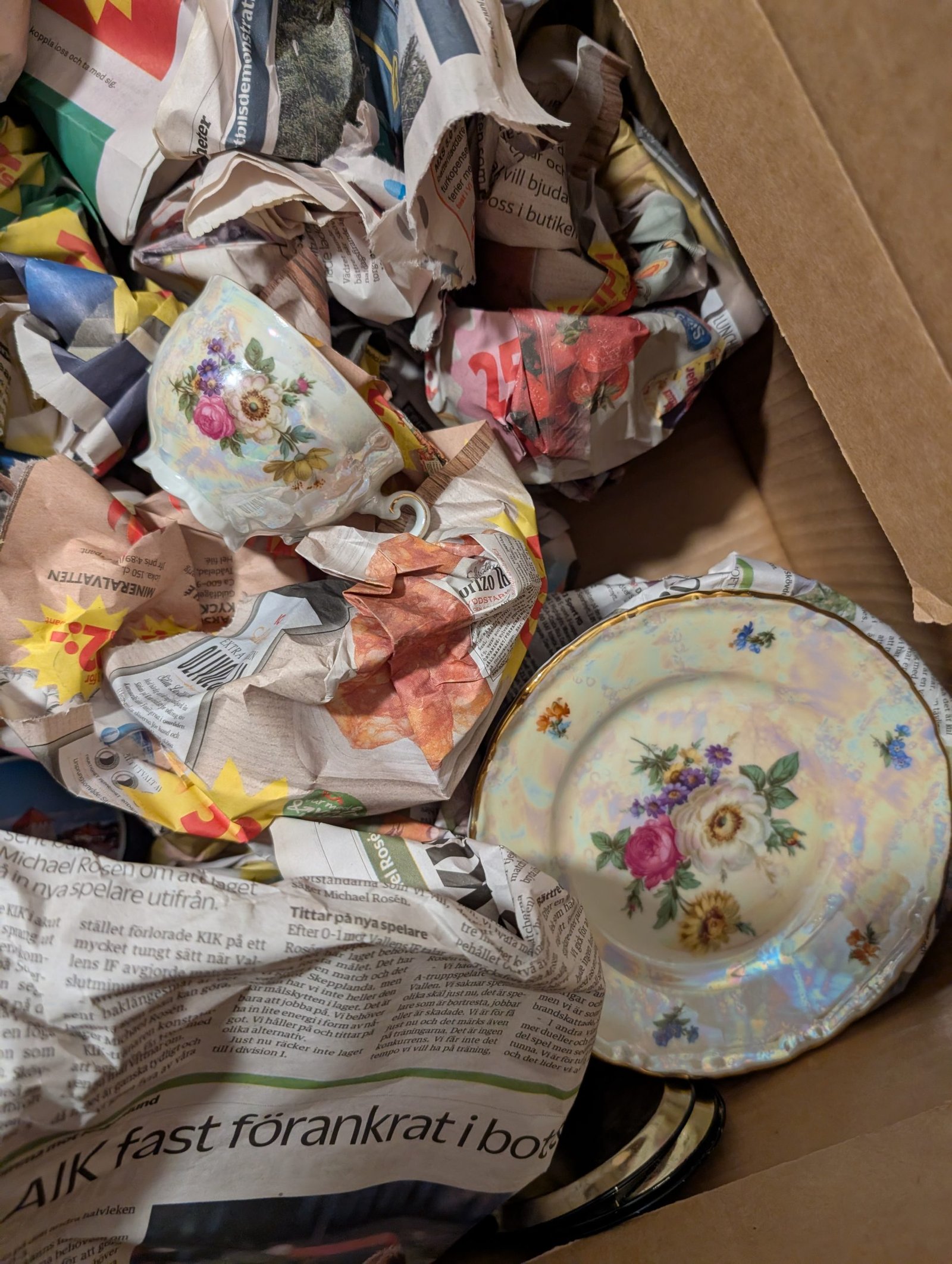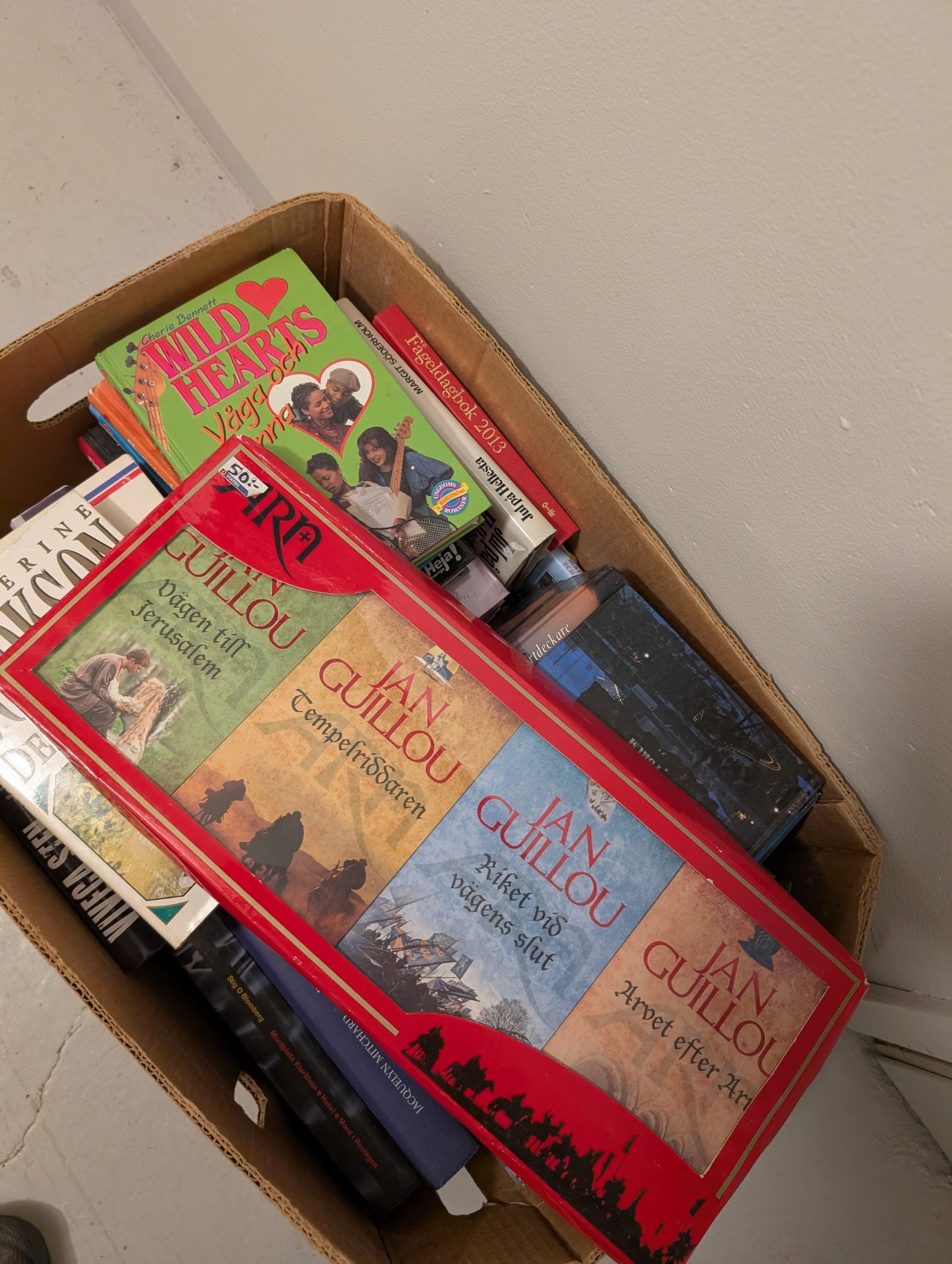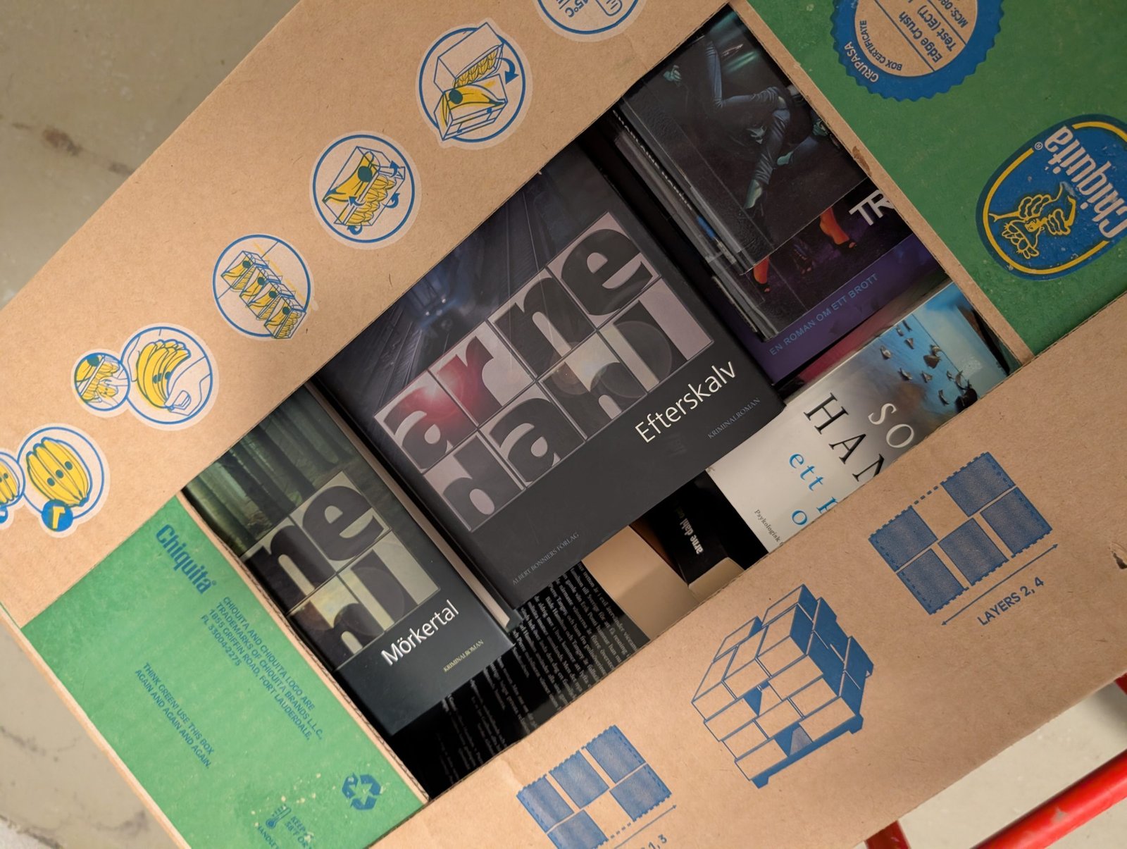 Gröna borda underlägg, en kasse med tidningen populär mekanik för alla (äldre tidningar). Flertalet lådor med böcker bland annat barnböcker, deckare med bland annat Stephen King, Viveca Sten, Arne Dahl, Elisabeth George.