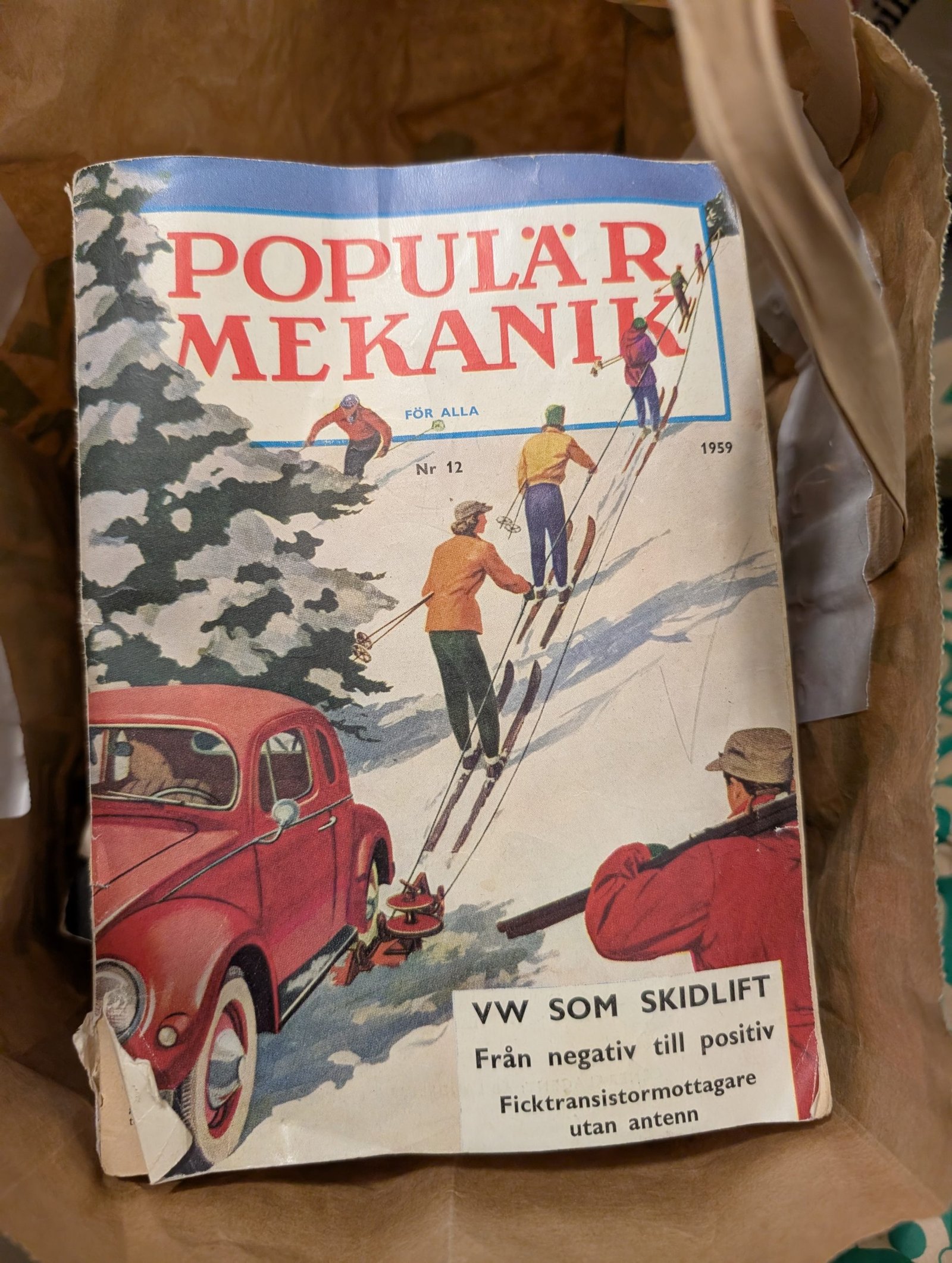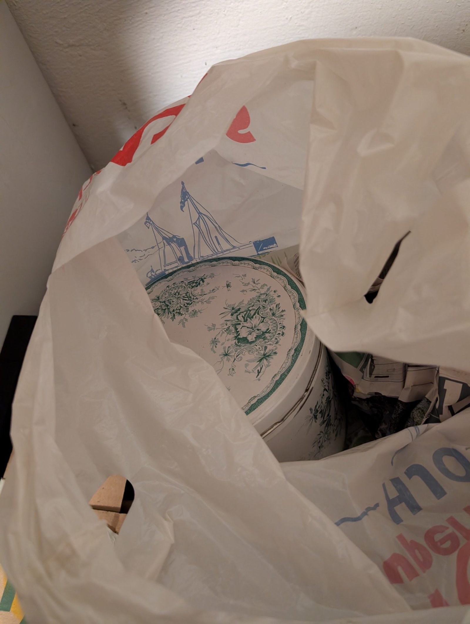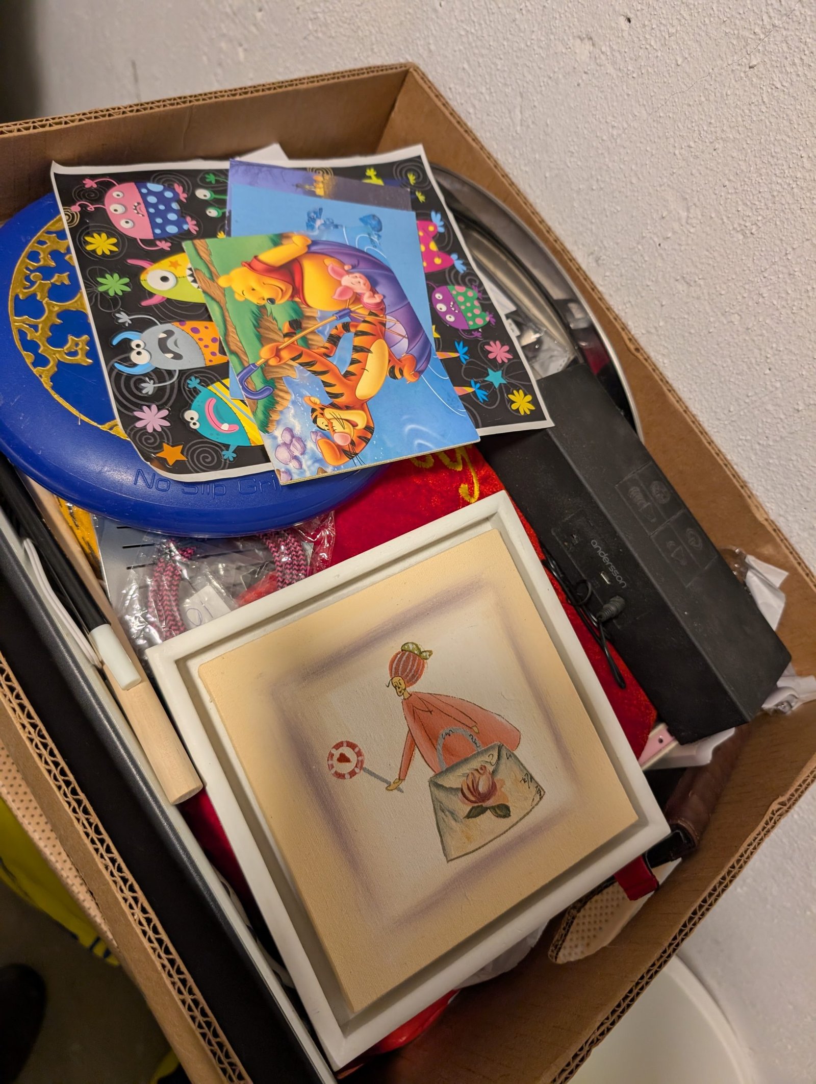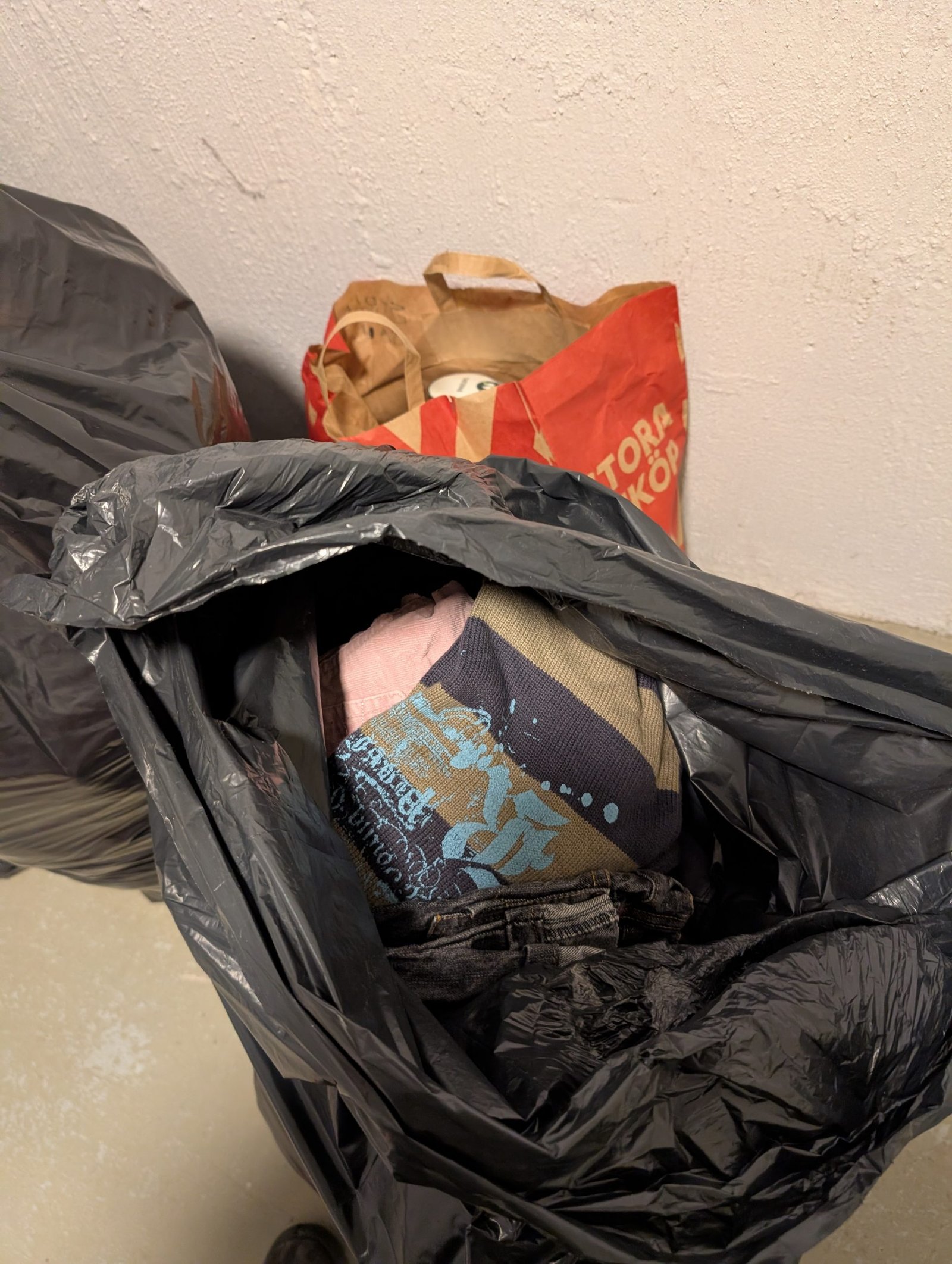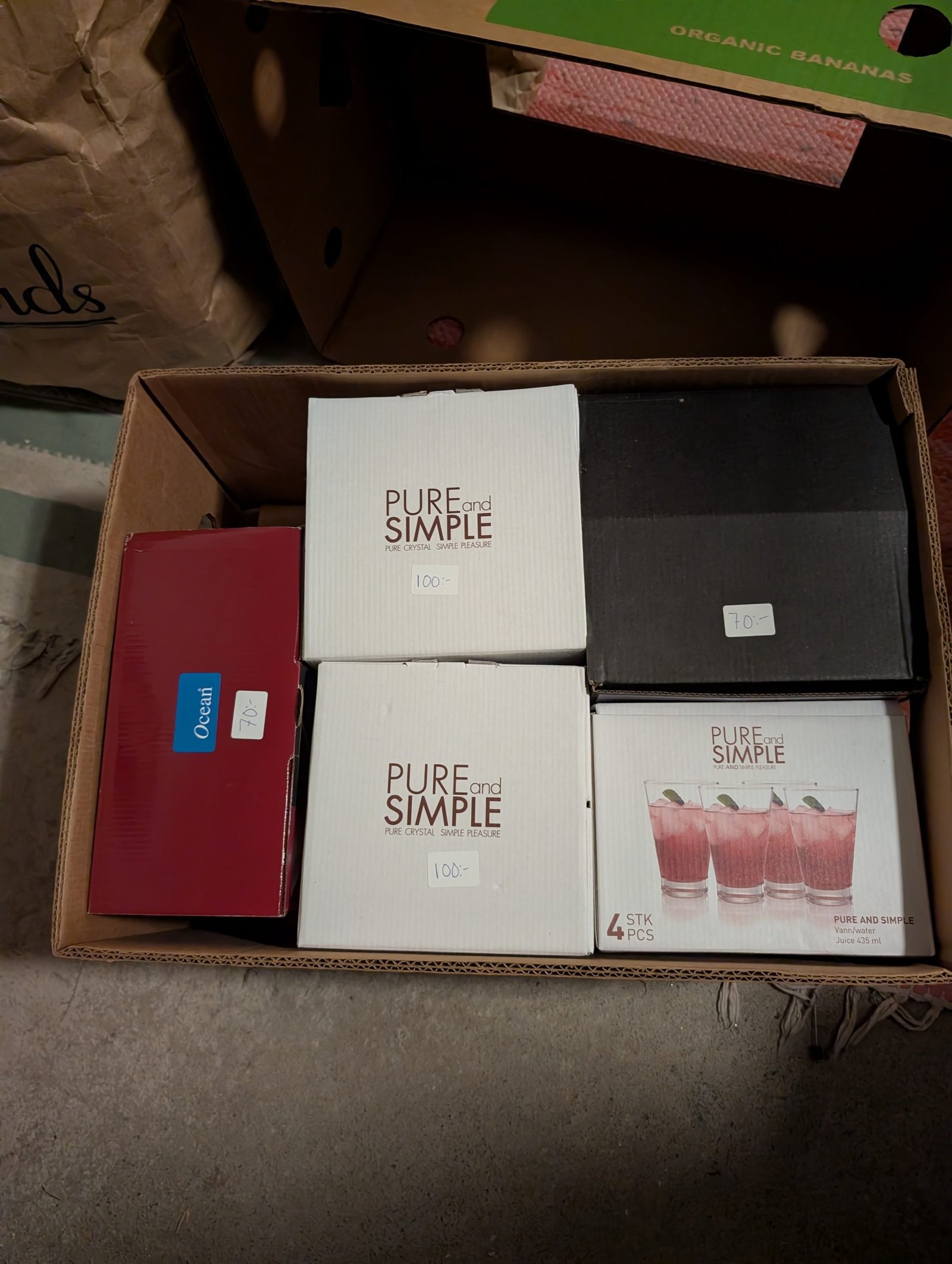 Gröna borda underlägg, en kasse med tidningen populär mekanik för alla (äldre tidningar). Flertalet lådor med böcker bland annat barnböcker, deckare med bland annat Stephen King, Viveca Sten, Arne Dahl, Elisabeth George.