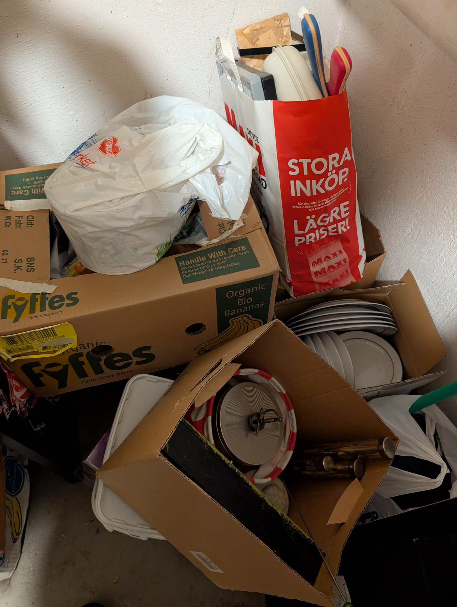 Två banan lådor och en påse med Gröna Anna servis, en ljusramp till bil, två påsar med ljus, 1200 vita plast demonstrations fat 7×2 cm, två stycken med 2000 demofat papper, en påse kläder, 1 blå mindre kylbag.