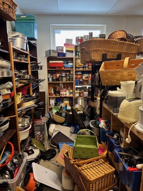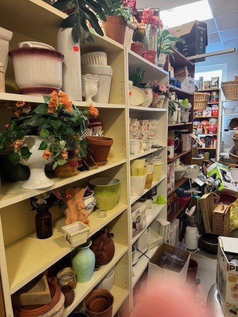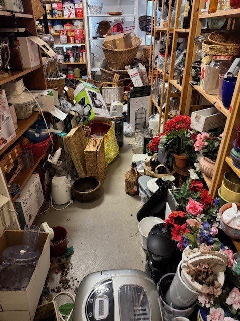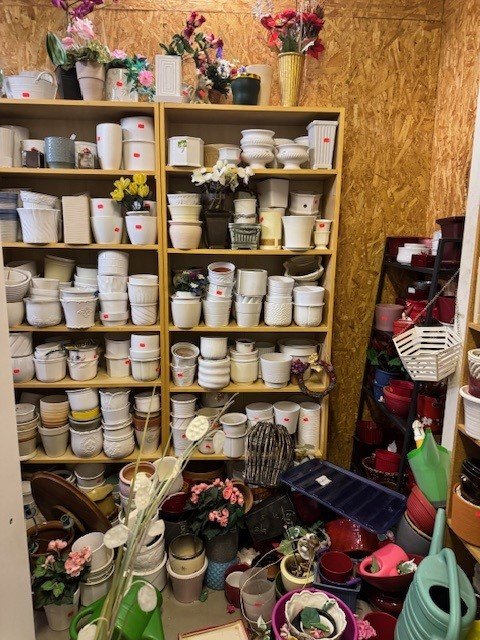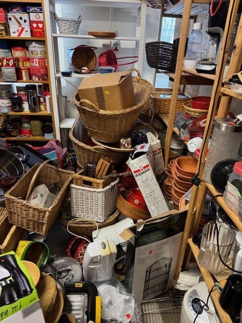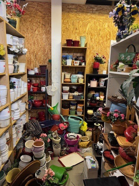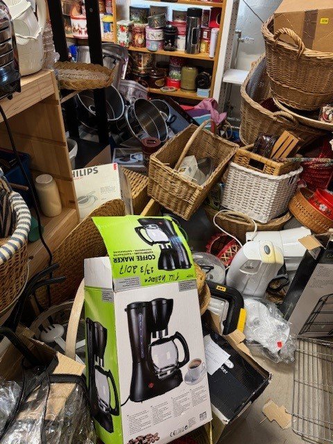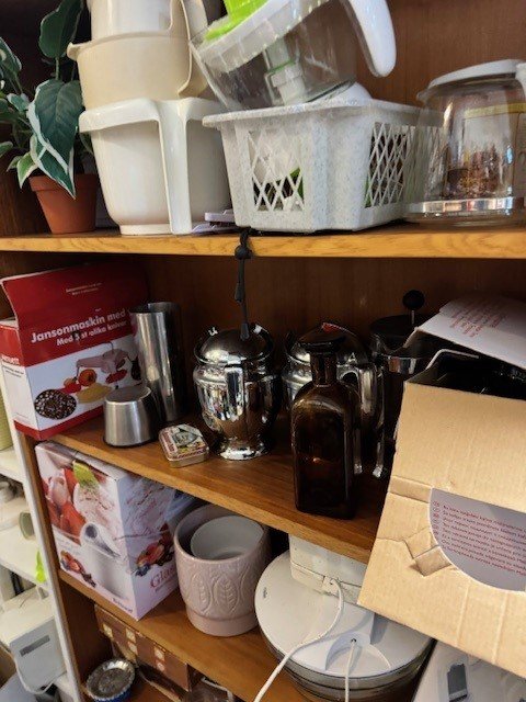 Större parti med blandade hushålls- och inredningsartiklar säljes. Innehåller bland annat krukor, korgar, köksredskap, burkar, glasflaskor, dekorationer, småmöbler samt diverse förvaringslösningar. Blandat material såsom trä, metall, plast och keramik.