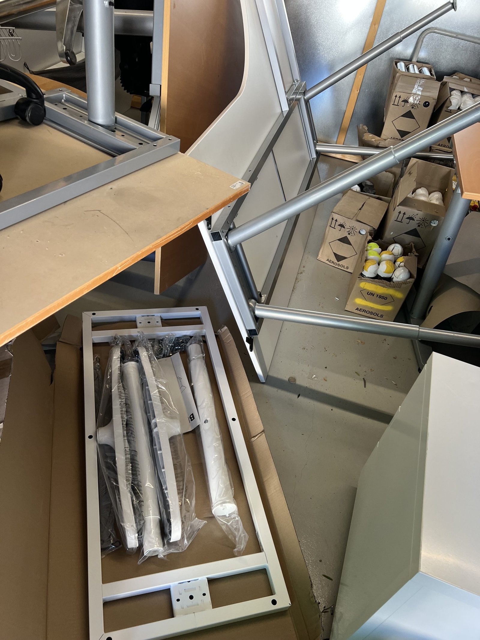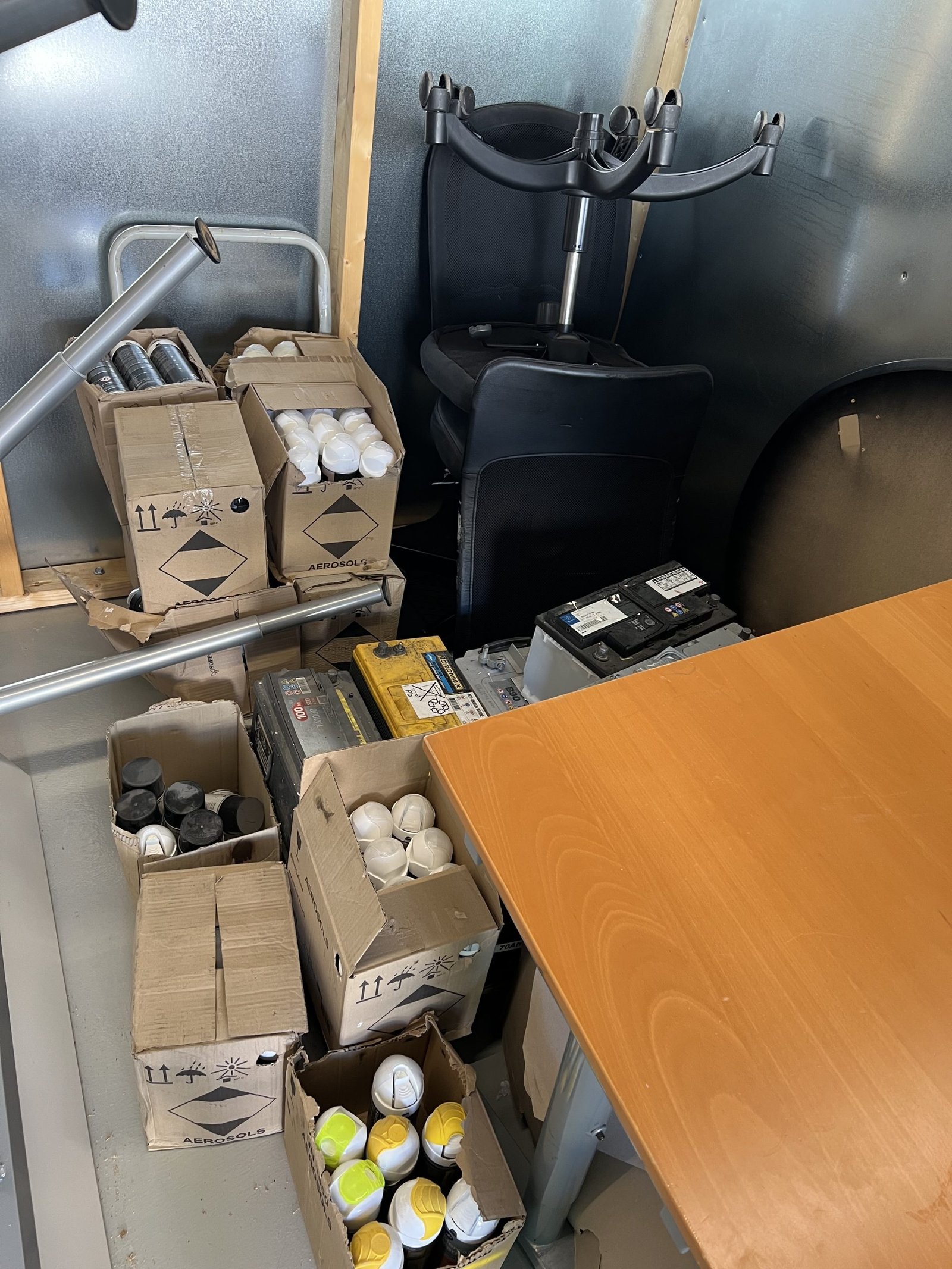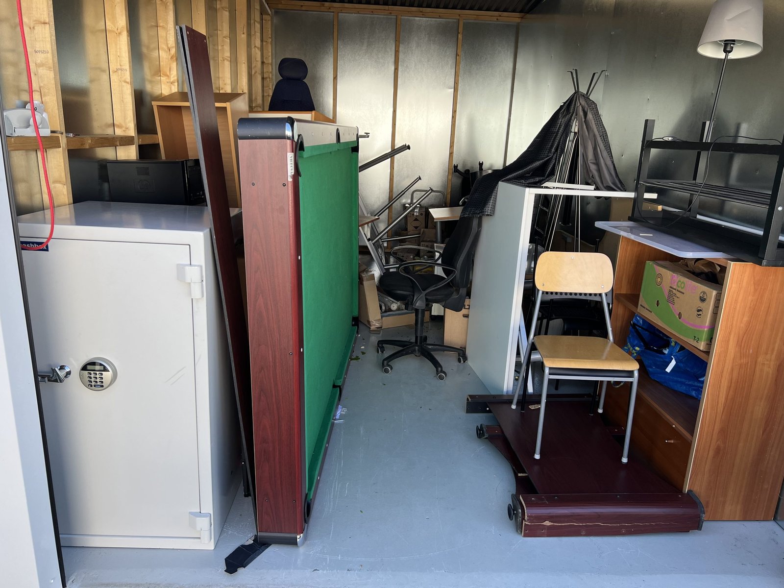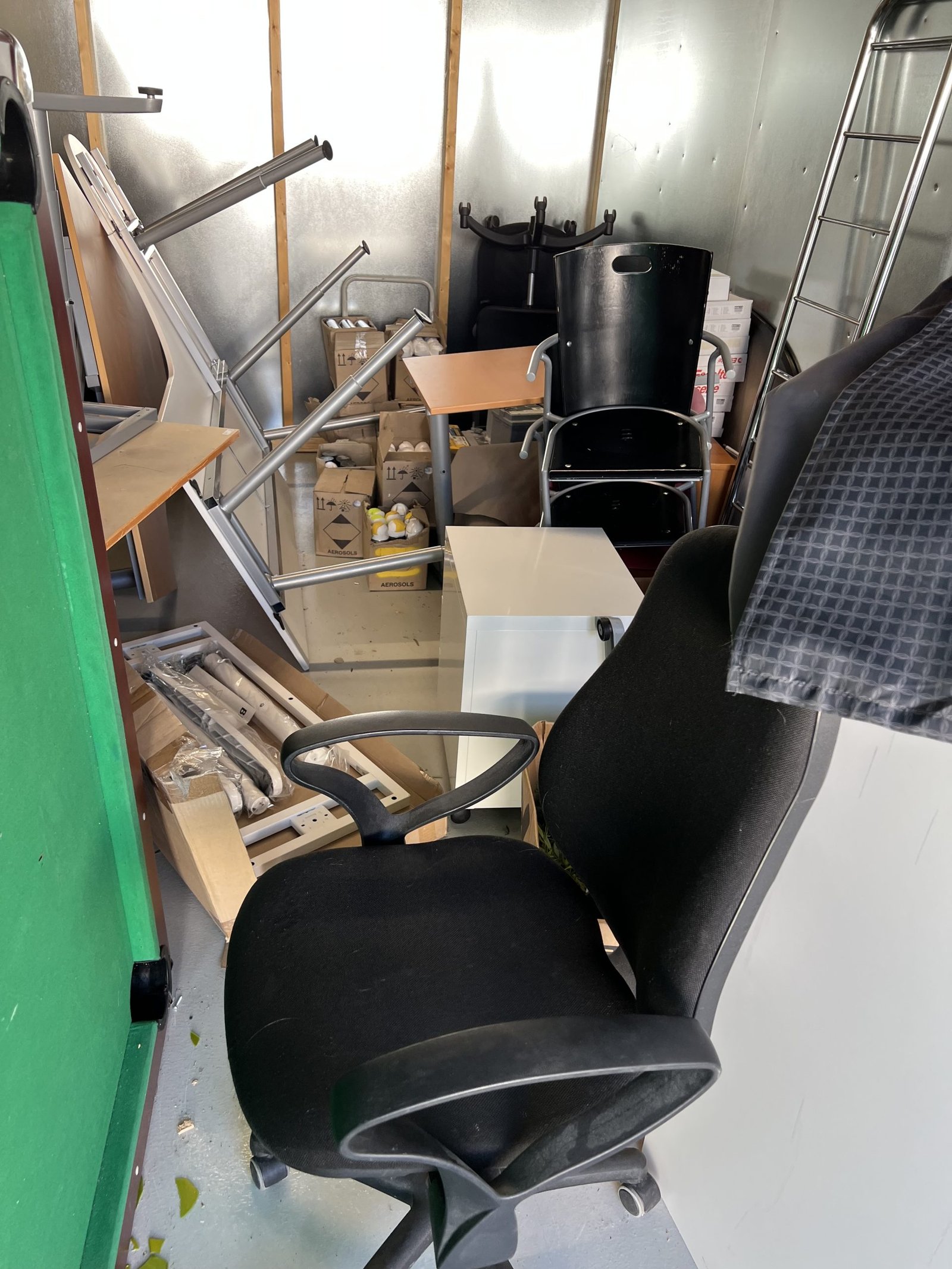 Företag som målat vägmarkering har gått i konkurs. Här finns 2 höj och sänkbara skrivbord samt ytterligare skrivbord och kontorsstolar. Kassaskåpet saknar nyckel och innehållet är okänt. Biljardbord är i sämre skick och det är okänt om det finns bollar det till det. Stort parti med sprayfärg för markering i oöppnade kartonger. Bilbatteri i okänt skick.